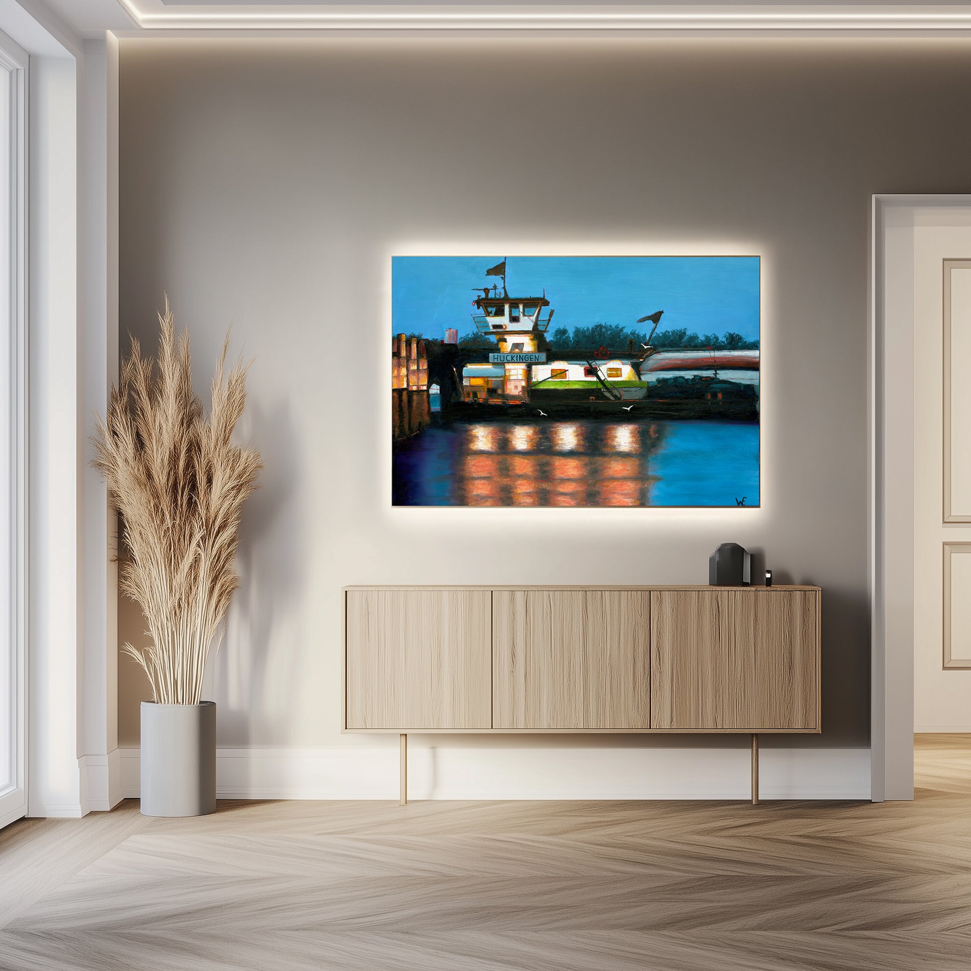 Alle Motive (Öl auf Leinwand) werden nach Fertigstellung hochauflösend eingescannt und anschließend auf Leinwand mit uv-beständigen Farben geplottet. Die fertigen Drucke werden dann auf 2-3 cm dicke Holzleisten gespannt (s. Beispielfoto). Ein Rahmen ist nicht notwendig. Die Seiten sind mitbedruckt. Weitere Größen auf Anfrage über Kontakt.