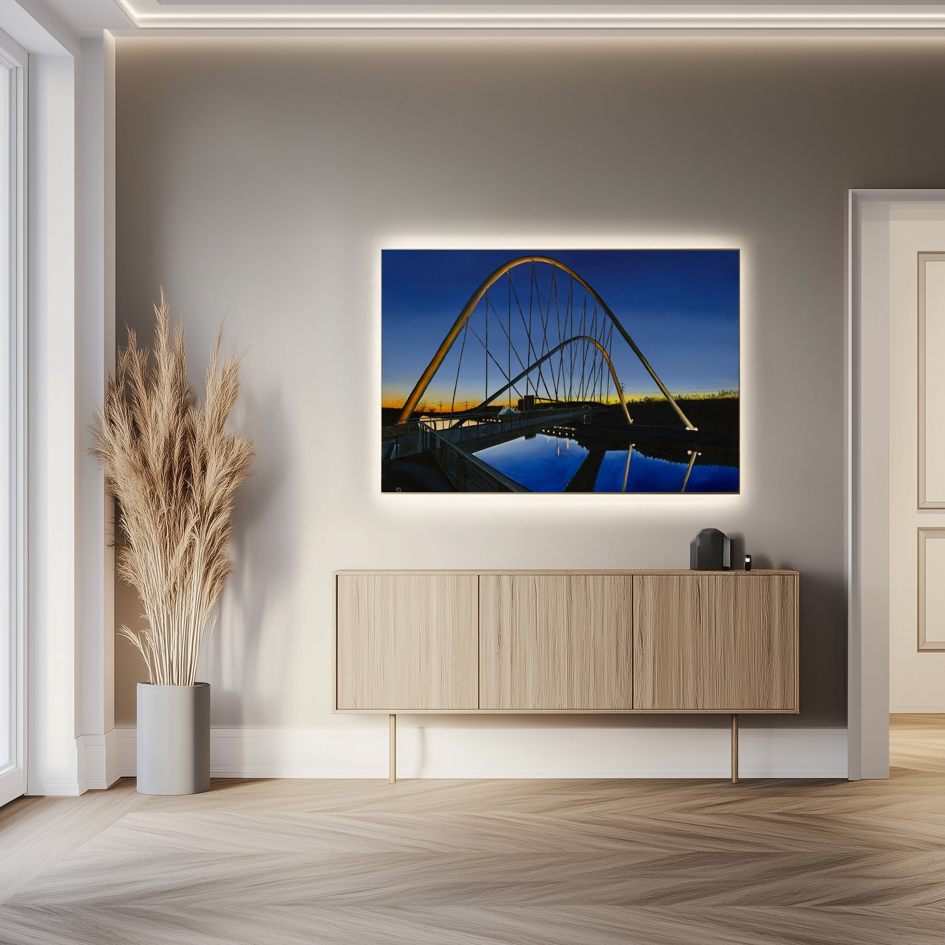 Alle Motive (Öl auf Leinwand) werden nach Fertigstellung hochauflösend eingescannt und anschließend auf Leinwand mit uv-beständigen Farben geplottet. Die fertigen Drucke werden dann auf 2-3 cm dicke Holzleisten gespannt (s. Beispielfoto). Ein Rahmen ist nicht notwendig. Die Seiten sind mitbedruckt. Weitere Größen auf Anfrage über Kontakt.